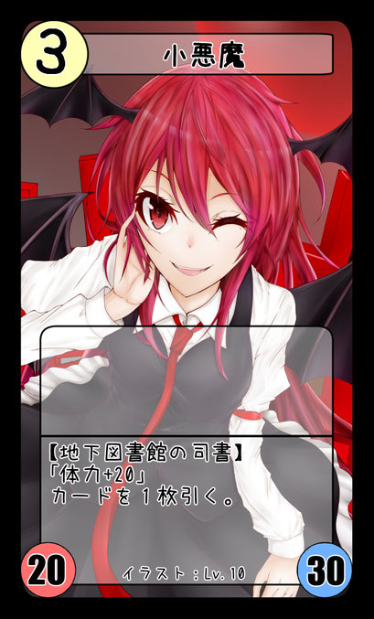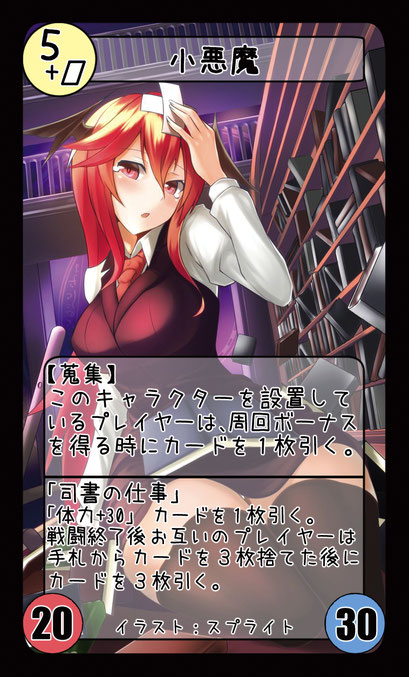 「司書のお仕事」 「体力+30」 カードを1枚引く。 戦闘終了後お互いのプレイヤーは手札からカードを3枚捨てた後にカードを3枚引く。 |