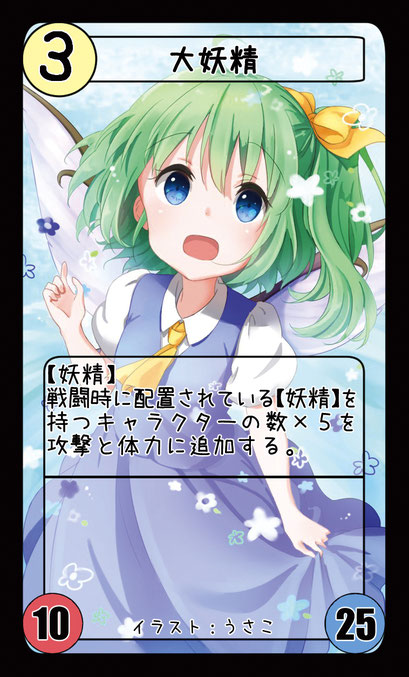 【大妖精】 「体力+20」 援護対象が【妖精】を持つなら更に「体力+10」 |