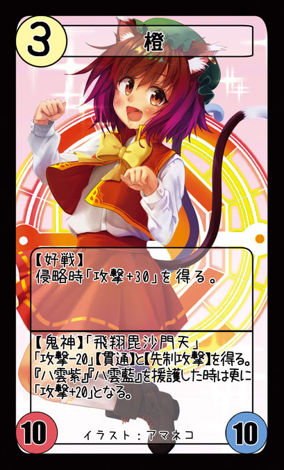 【鬼神】「飛翔毘沙門天」 「攻撃-20」【貫通】と【先制攻撃】を得る。 『八雲紫』『八雲藍』を援護した時は更に「攻撃+20」となる。 |