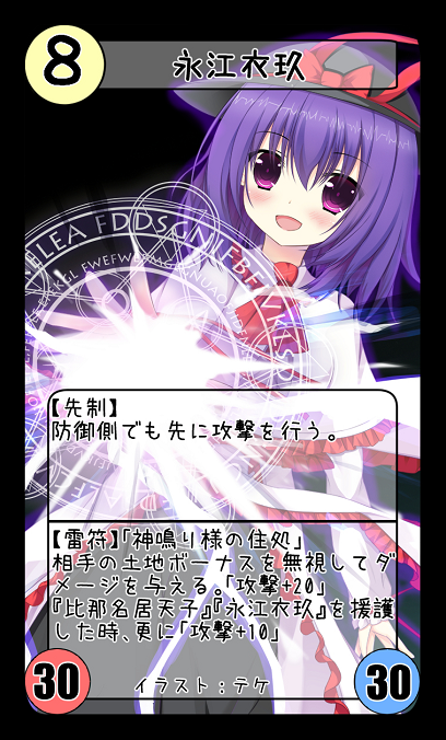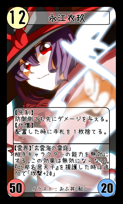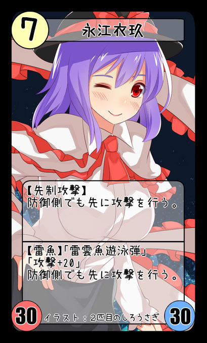 【雷符】「神鳴り様の住処」 相手の土地ボーナスを無視してダメージを与える。「攻撃+20」 『比那名居天子』『永江衣玖』を援護した時、更に「攻撃+10」 |