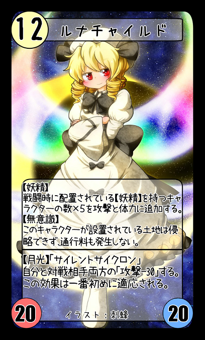 【妖精】 戦闘中、フィールドに設置された【妖精】を持つキャラクターの数×5を攻撃と体力に追加する。 【無意識】 このキャラクターが設置されている土地は侵略できず、通行料も発生しない。 |