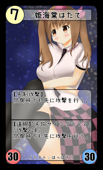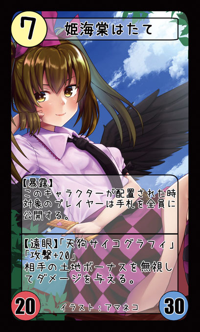 【遠眼】「天狗サイコグラフィ」 「攻撃+20」 相手の土地ボーナスを無視してダメージを与える。 |