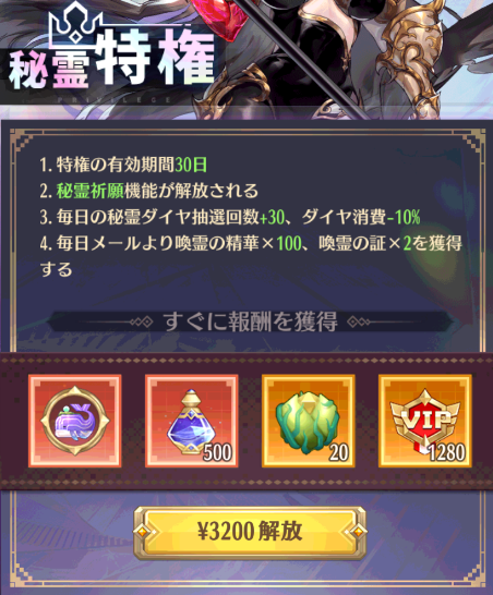 秘霊ガチャを引ける「喚霊の証」2個を1ヵ月間もらえる。