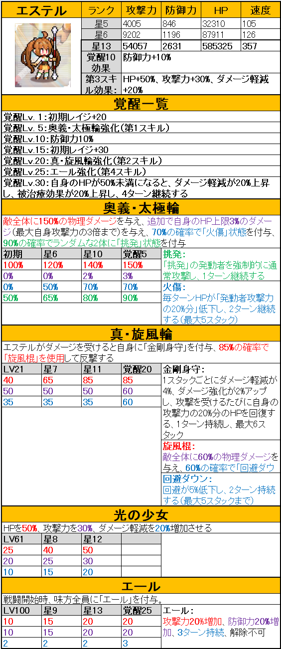 聖光 | エステル | 54057 | 2631 | 585325 | 357 | HP+50%、攻撃力+30%、ダメージ軽減+20% | 防御力+10% |