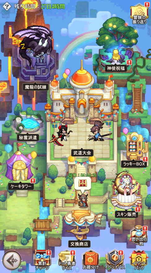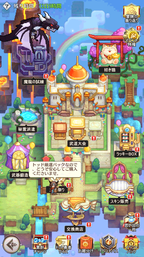 魔龍の試練3回→招き猫→累計チャージ(ダイヤ回収)→ドット勇者クイズ(ログボ)