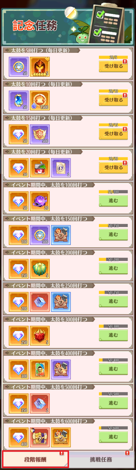 →太鼓祭り(20回※ログボ10個しか貰えないので注意)