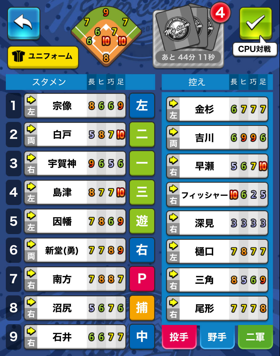 - 代打の神様•••多くの人が言っていますが代打で起用されると長+1,ヒ+1の実装