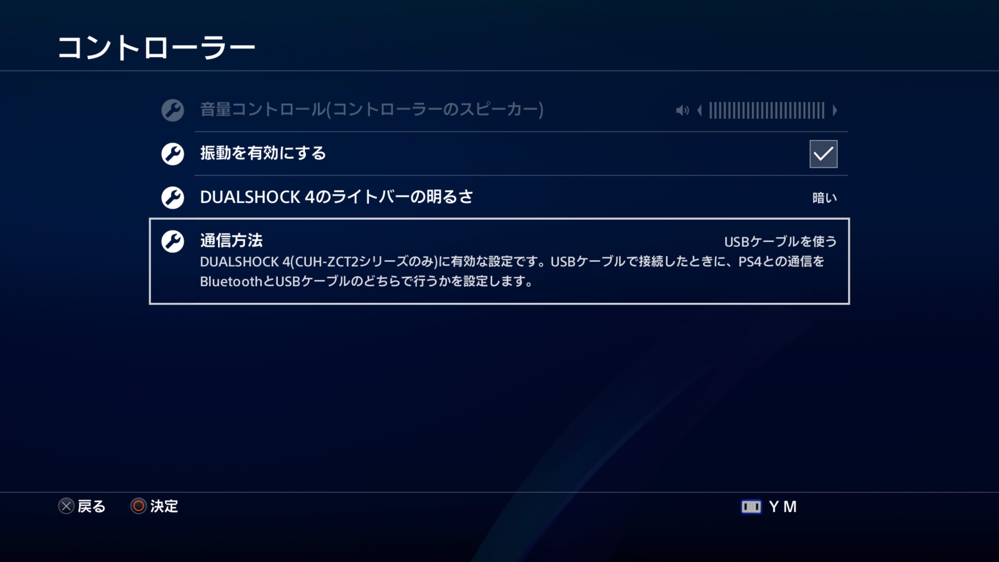 - PS4の[設定]>[周辺機器]>[コントローラー] を以下の設定にする