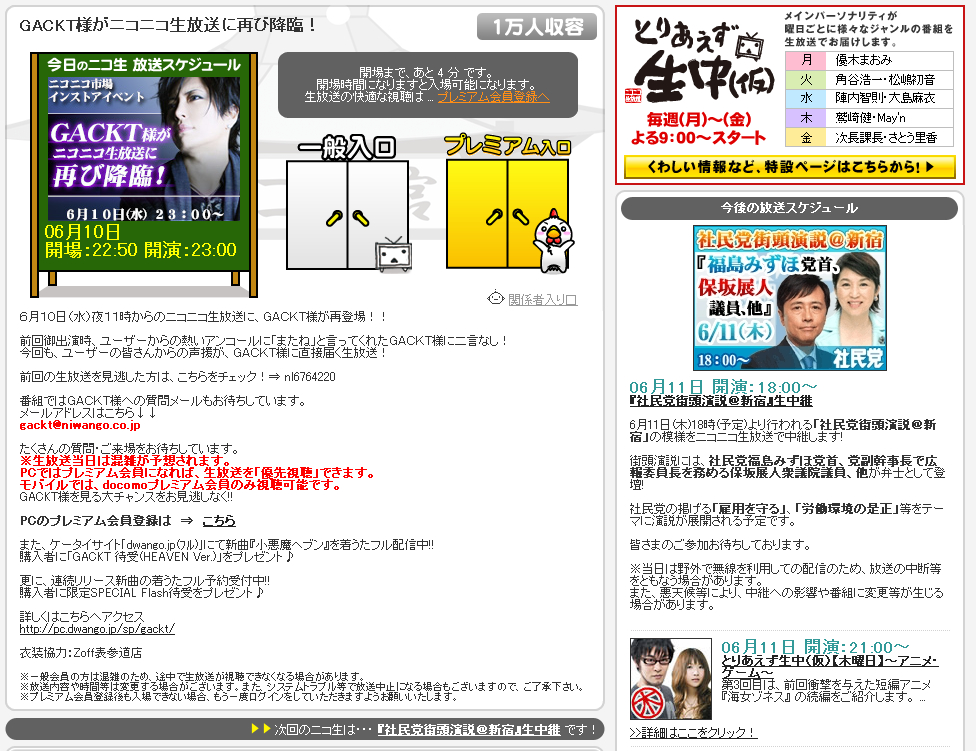 ニコ生『GACKT様がニコニコ生放送に再び降臨!』 1 | ニコ生『GACKT様がニコニコ生放送に再び降臨!』 2 |