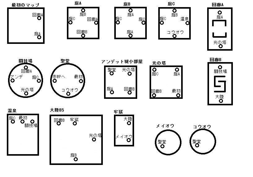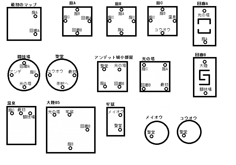 最初のマップを東に次のマップでパターン判定し庭A→回廊B→大陸Dマップ→牢獄→メイオウ→聖堂→コウオウ→聖堂→赤WP小部屋