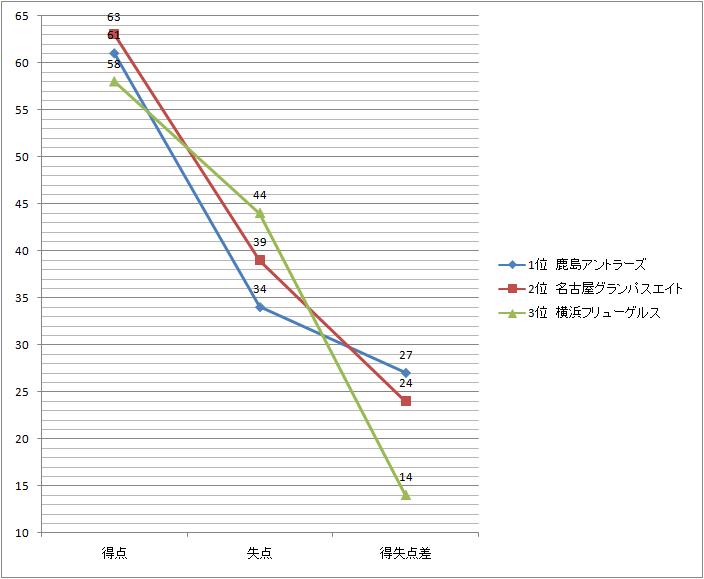 リーグ上位3チームの得点・失点・得失点差の違いをグラフにして、分かり易くしましました。