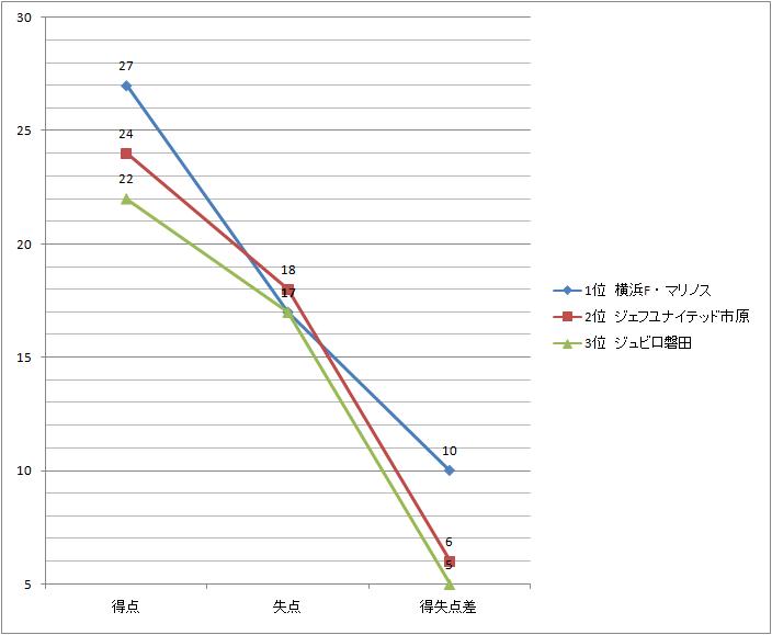 リーグ上位3チームの得点・失点・得失点差の違いをグラフにして、分かり易くしましました。