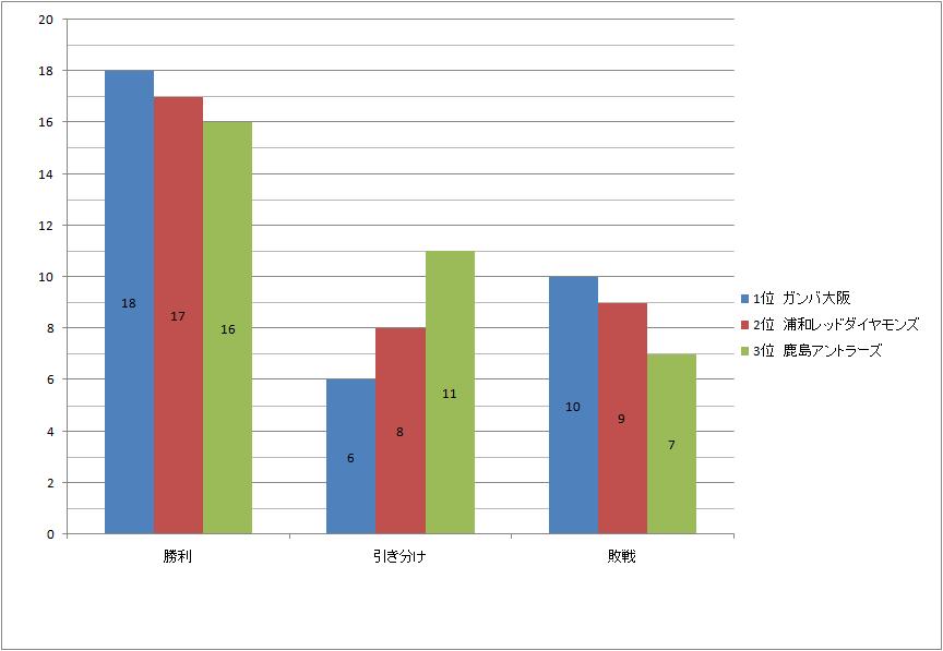 リーグ上位3チームの勝敗の違いをグラフにして、分かり易くしましました。