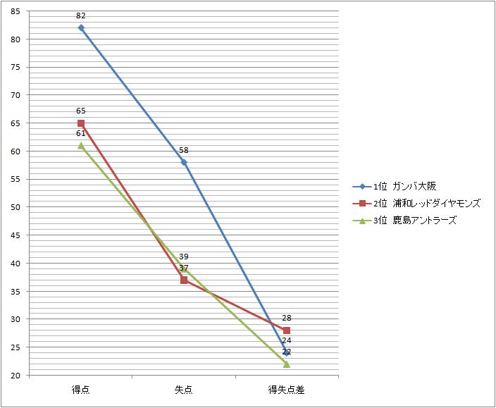 リーグ上位3チームの得点・失点・得失点差の違いをグラフにして、分かり易くしましました。