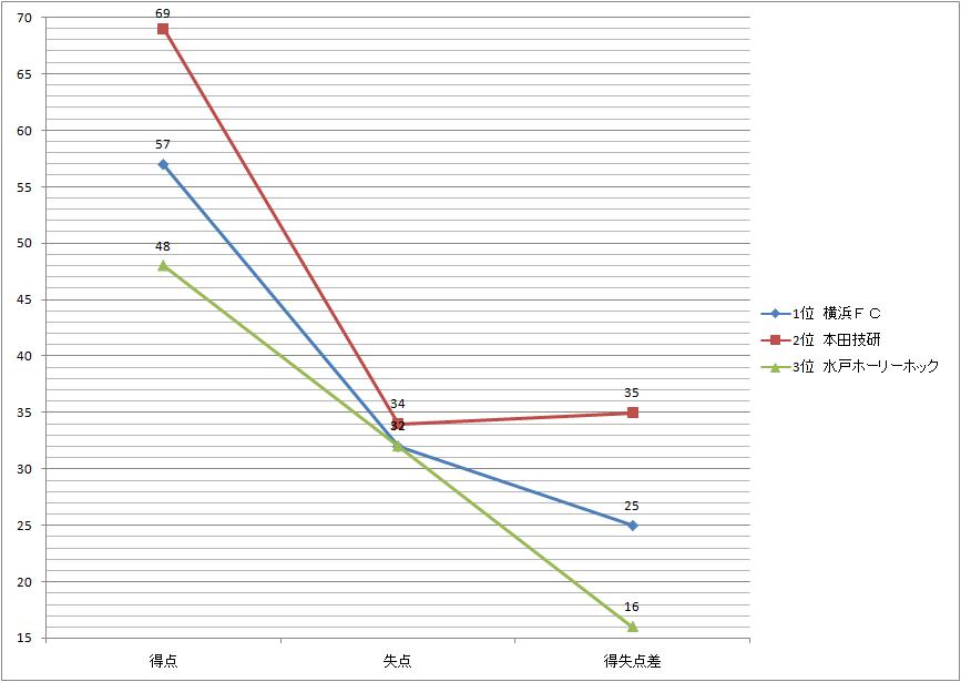 リーグ上位3チームの得点・失点・得失点差の違いをグラフにして、分かり易くしましました。