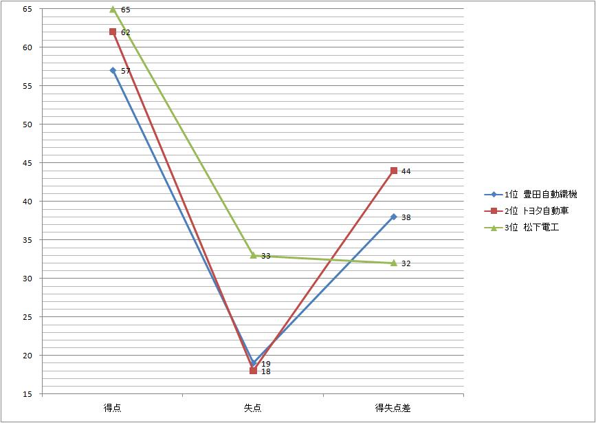 リーグ上位3チームの得点・失点・得失点差の違いをグラフにして、分かり易くしましました。