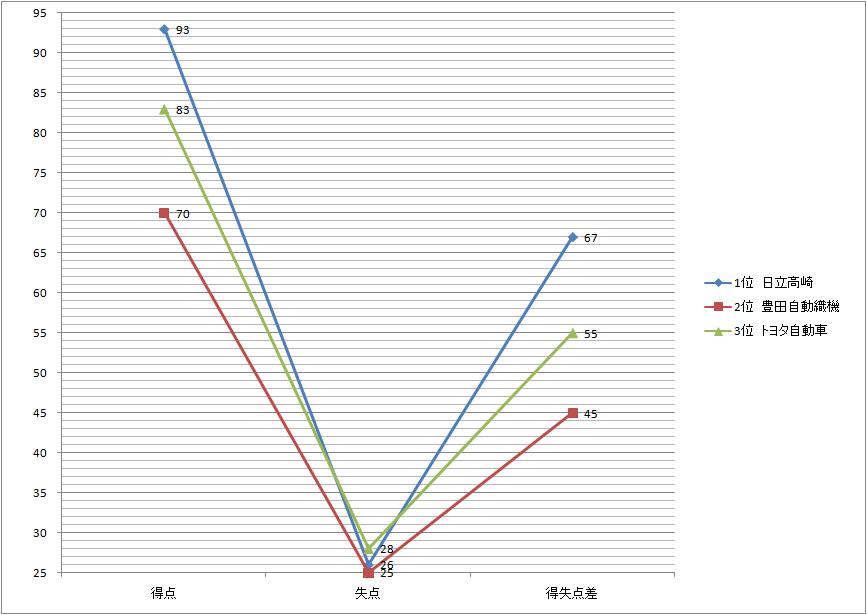 | 1位 日立高崎 | 93 | 26 | 67 |