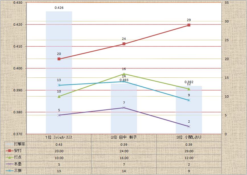 | 1位 ミッシェル・スミス | 16 | 47 | 0.426 | 20 | 10 | 5 | 13 |