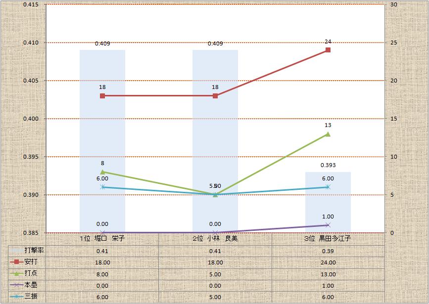 | 3位 黒田多江子 | 23 | 61 | 0.393 | 24 | 13 | 1 | 6 |