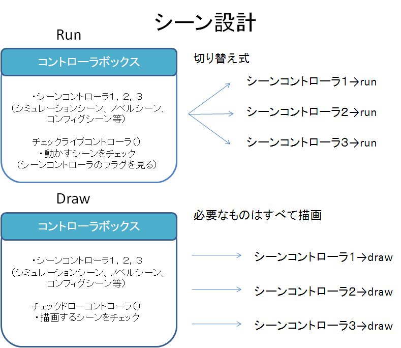 Runというのはコントローラの受け付け、及び計算処理部分で、基本的には常に1シーンだけの