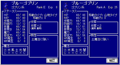 - 青い魔法型ゴブリン。雇用費が20なら戦力値も20。