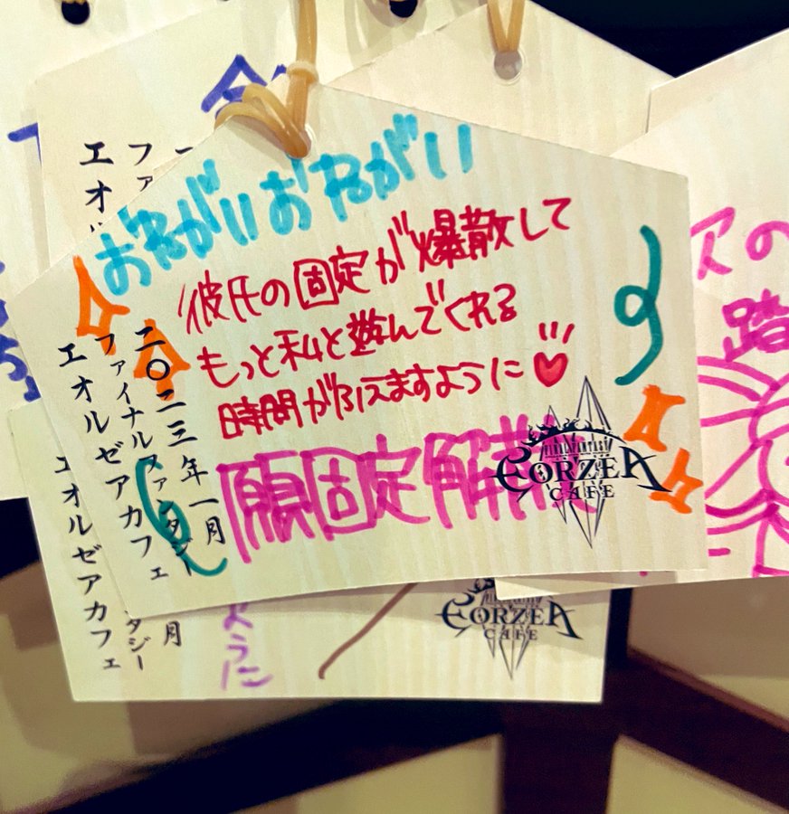 エオルゼアカフェ大阪にて、遊んで欲しさのために交際相手の固定解散を祈願する絵馬が発見される。