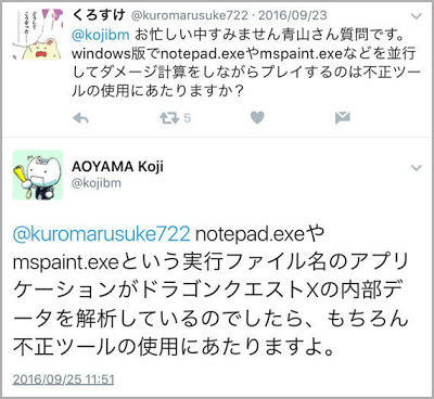 当時はDQ10のテクニカルディレクターであった青山公士氏から外部ツール使用の言質を取ろうとし、意図を読まれて適切な返しを受けてしまったリプライ。