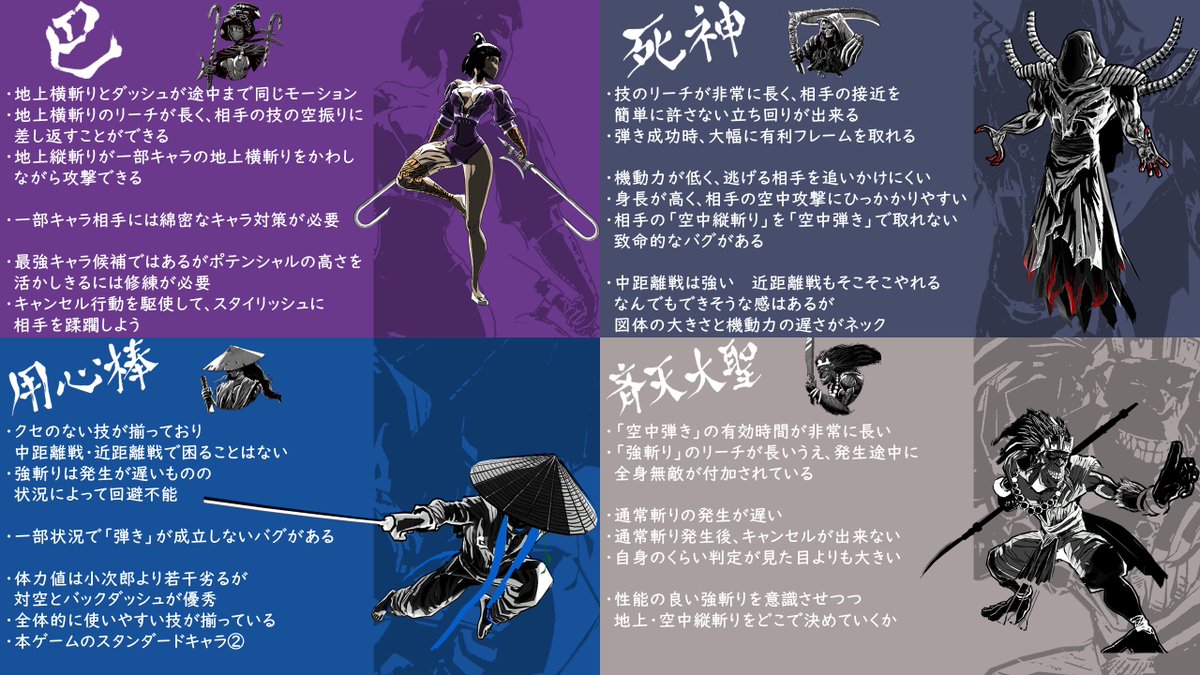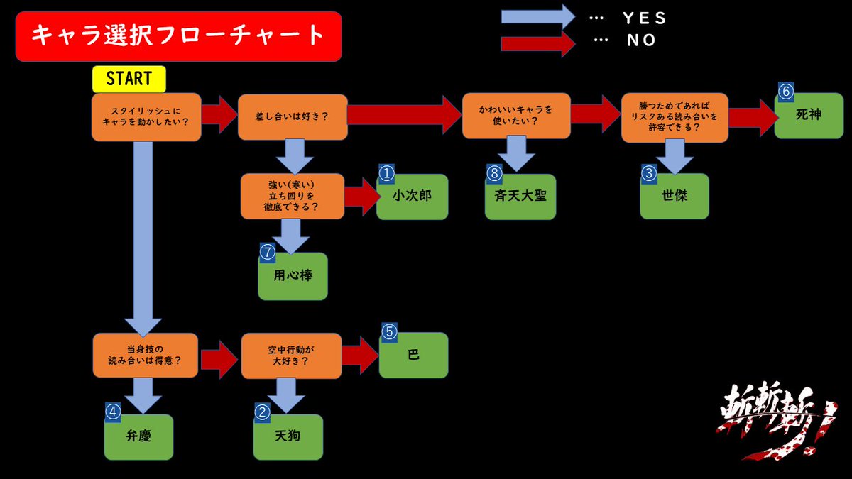 キャラクター選びにお悩みの方に、各キャラ選択フローチャートと、簡単な解説を載せておきます。
