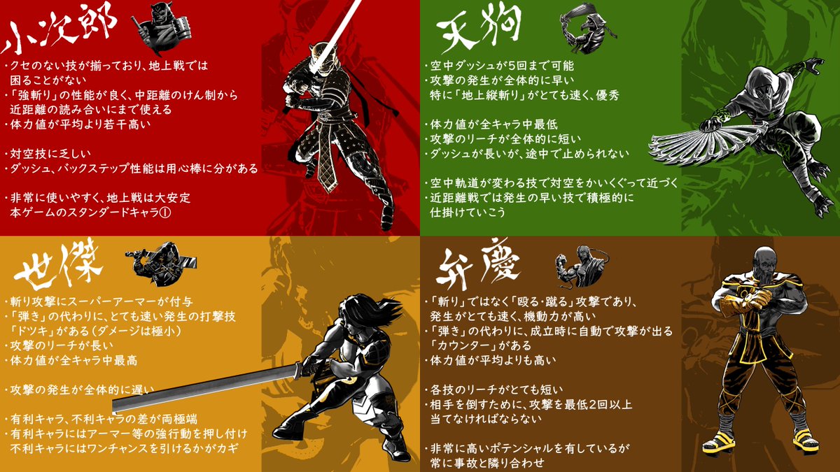 また、選択できる8キャラにも明確な性能差があり、本家ブシドーブレードのような差し合い距離のギリギリを保ちながら相手の様子をうかがう展開になる対戦カードもあれば、ハイスピードな読みあいを展開しあう対戦カード、はたまた2D格ゲーよろしく圧倒的なキャラ差を押し付ける試合もあり、バラエティ豊かな対戦を気軽に楽しむことができます。