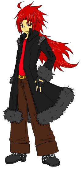 服装は、上は黒のロングコート、真紅のシャツ、下は、少しだぶだぶのズボンと漆黒のグリーブ。