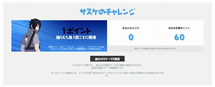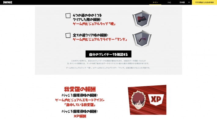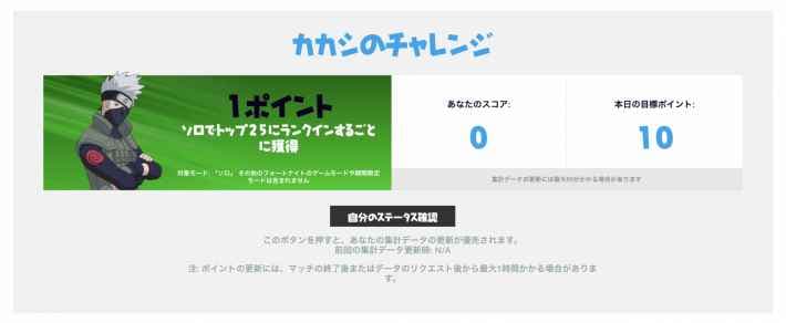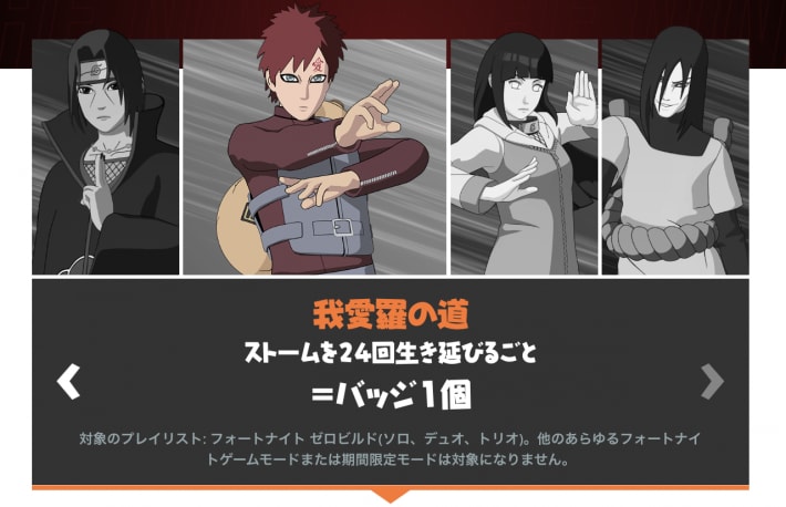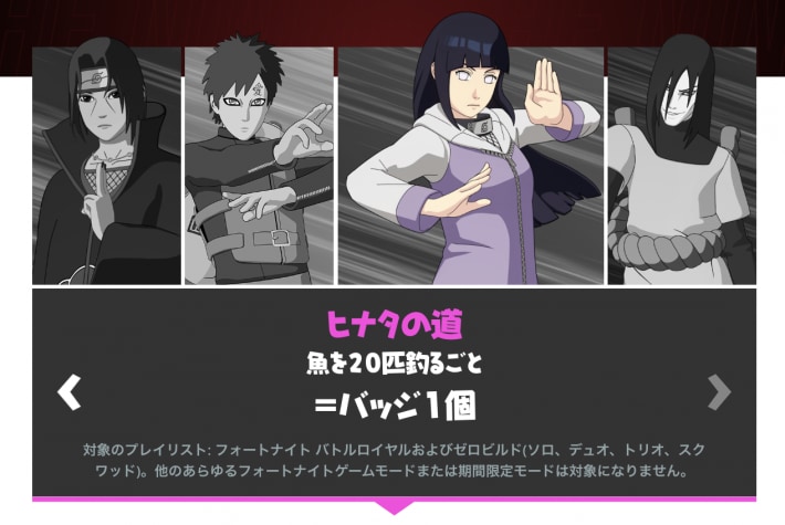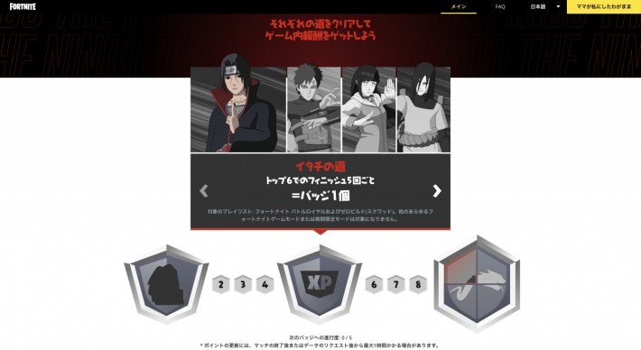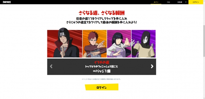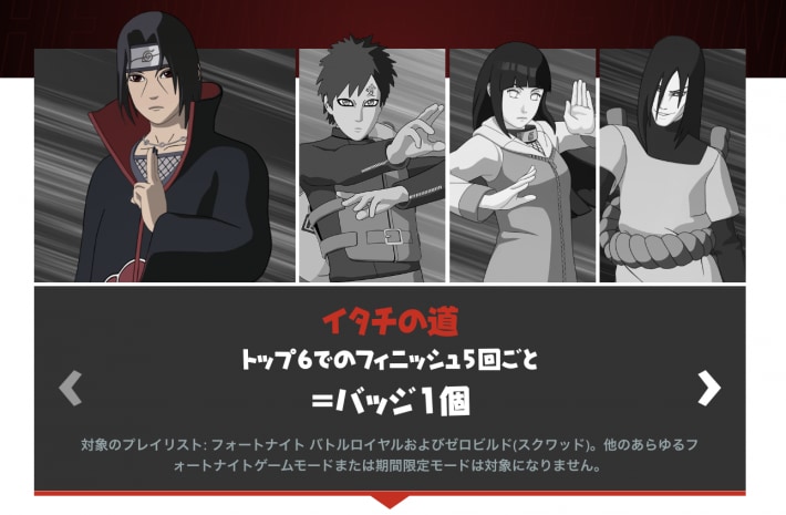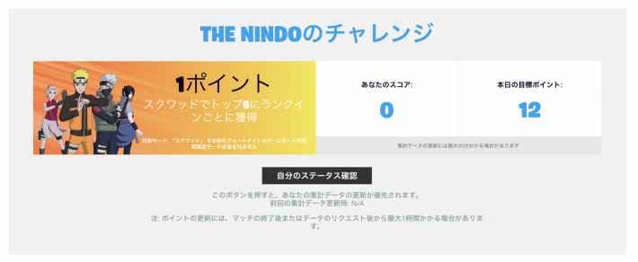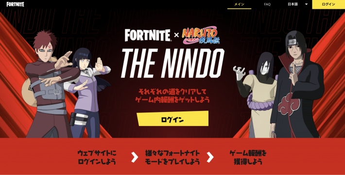 コミュニティバトル「THER NINDO」の公式サイトに連携し、フォートナイトをプレイして定められたチャレンジをこなすことで、ナルトコラボ報酬をゲットできる。