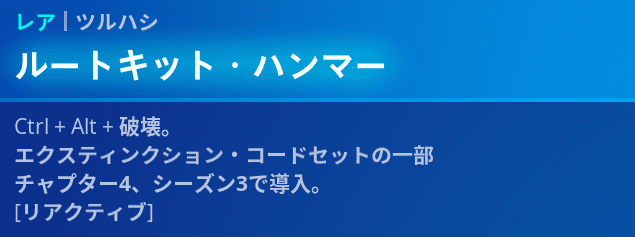 フォートナイト(Fortnite)の収集ツール(ツルハシ)「ルートキット・ハンマー」の情報をまとめています。「ルートキット・ハンマー」を入手する際の参考にしてみてください。
