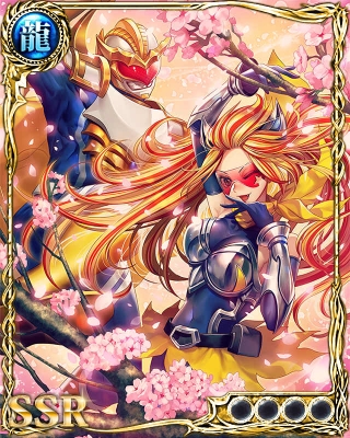 ・敵全員に極大ダメージを与え、更に味方全員の全パラメータが特大アップし、更にアップさせたパラメータ分、自身のパラメータに上乗せされる。 ・更に味方全員の手札Pが大回復する。 ・智の構え発動時、効果は得るが残り有効回数を消費せず、アップ効果が2倍になる。 ・水の構えの効果も受ける。 ・水の構え発動時、50%の確率でスキル使用回数を消費しない。 ・レベルが上がると威力と効果が増加する。 |