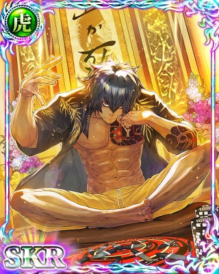 ・最も防御が低い敵1人に絶大ダメージを与える。 ・役チェイン時、自身にスキルを使用しても手札の更新を行わない効果を15秒間与える。 ・この効果は重ねがけできない。 ・嵐皇の構え発動時、覚醒の構え発動中以外に使用すると、サポートスキルの発動率が増加する。 ・手札に相手より上の役が揃っている状態でこのスキルを使用すると、相手の発動したサポートスキルをすべて無効化し、相手の防御アップ値の影響を無視して自身の特攻と防御パラメータを加算して攻撃する。 ・レベルが上がると威力が増加する。 |