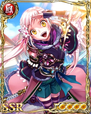 前衛[風]【役完成】八重・桜花輪舞 消費手札P 40 単体使用回数 1回 [必殺][敵全員][使用毎に威力増加] [嵐皇の構え:確率で使用回数消費なし][複数奥義効果] [焔帝の構え:回数消費なし・火属性サポスキ発動] [役完成:フォーカード][1回] |