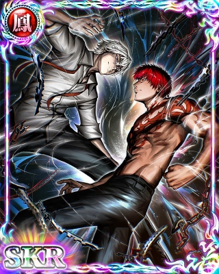 | 【状態異常:暗闇】 ・敵全員に超絶ダメージを与え、全パラメータが超絶ダウンする。 ・急所に当たりやすい。風の構えか【諸刃】風の構え発動時、サポートスキルの発動確率が増加し、威力が2倍になる。 ・対象を気絶させた場合、《【煌】加賀美純吾&堂外涼幻◆カウント》が5増え、スキル使用後、手札にジョーカーが1枚来る。 ・抗争時間が残り10分を切ると、気絶させた対象を強制的に後衛に下げ、ランダムで敵後衛を前衛に引きずり出す。 ・敵チームに後衛がいない場合、効果は発揮されない。 ・更にスキルによる強制交代に関わった敵は10秒間「使用する必殺・飛び道具スキルで与えるダメージを20%の確率で無効にする」効果を与える。 ・この効果は重ねがけはできない。 ・レベルが上がると威力と効果が激増する。 |