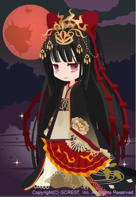 | 外見的特徴 | 髪:くるぶしまである長い真っ直ぐで整った黒髪を赤い紐で一つに結っている。 頭には細かい金細工の冠が輝く。 顔:肌は白く、生気のない瞳は赤い。 服装:十二単を模した作りの着物。中は淡い亜麻色で羽織は黒。 手には金で装飾された赤い扇を持っている。 身長:145㎝。 |