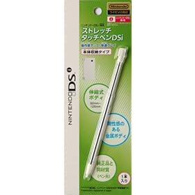 | ホワイト | ¥ 525 | モリゲームズ | オススメ度★★★★ DSiの仕様にあわせてるから縮めた状態はDSL用より長いけど伸ばした状態だと長さ一緒。 タッチ感はペン先を純正と同じ素材を使っているので非常に滑らか ペン尻のデザインがDSL用のストレッチタッチペンと同様に本体のラインに合ったもので本体との一体感がある 指の引っ掛かりも良く非常に取り出しやすい 伸縮させる時の感触はサイバーよりもスムーズで高級感あり 伸ばした時の長さ125mm 長期使っていたら、すぐに本体から抜けるようになった。 DSiとペンとどっちに原因があるかは不明  | |