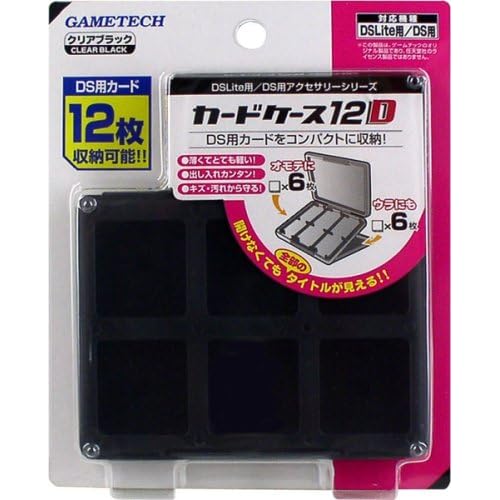 | DS Lite用/DS用『カードケース12D』 | ブラック | ¥ 800 | ゲームテック | いいところ 6Dと比べて片面6枚になった分、たくさんのソフトを一気に確認できて楽。 DSカード固定の仕方が変わり、出し入れが楽になった。 構造は同じだが、大きい分外側のふたの開け閉めが楽。 6Dを2つ使うよりも若干省スペースで同じ枚数収納できる -悪いところ DSカードを入れる方向が決まっていて、逆に入れるとすぐに外れる。 ふたを上に開けたとき、片面6枚のうち上3枚は普通だが、 下3枚は上下逆さまに固定しないといけない。 持ち歩くには少々大きい。 | ||