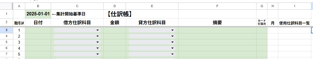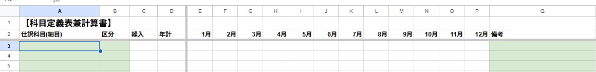 ※記帳するときに手入力するセルは、うす緑に着色している。