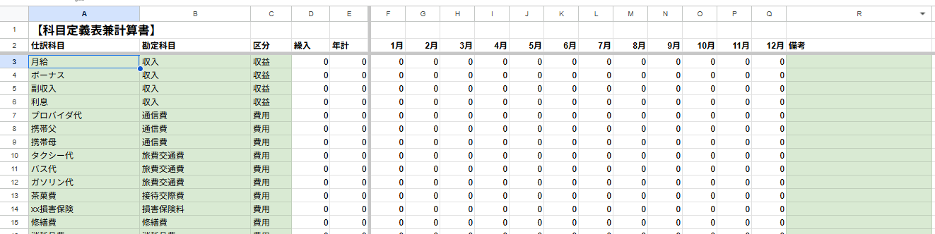 - 計算書 仕訳項目の定義及び1-12月集計を一覧するシート(未完成)