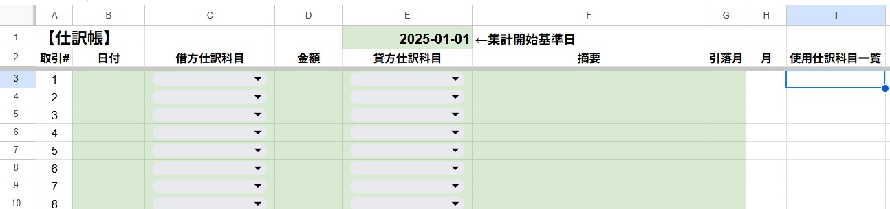 - I列 作業用の列。普段は非表示にしておく列。仕訳帳で使われている仕訳科目を抽出する。元帳シートから参照する。セルI3に次の式を入れる。