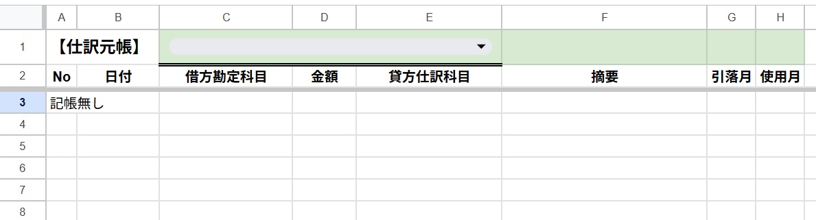 =ifna( filter('仕訳帳'!$A$3:$H, '仕訳帳'!$B$3:$B<>"", ('仕訳帳'!$C$3:$C=$C$1) + ('仕訳帳'!$E$3:$E=$C$1), isblank($F$1) + isnumber(search($F$1, '仕訳帳'!$F$3:$F)), isblank($G$1) + ('仕訳帳'!$G$3:$G=$G$1), isblank($H$1) + ('仕訳帳'!$H$3:$H=$H$1) ) ,"記帳無し")
