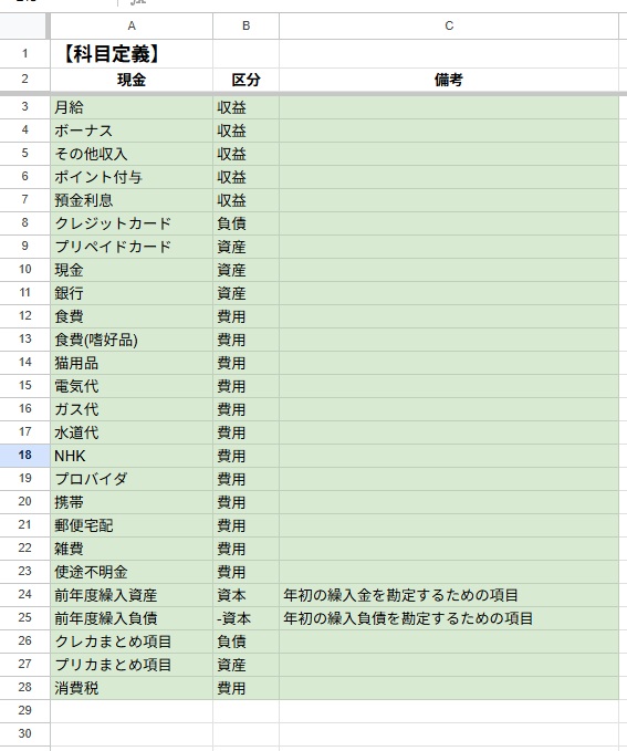 - B列 区分 勘定科目のグループ(収益、費用、資産、負債、資本)の事。それらをまとめていう言葉が見当たらなかったので、ここでは区分という言葉を使うことにした。