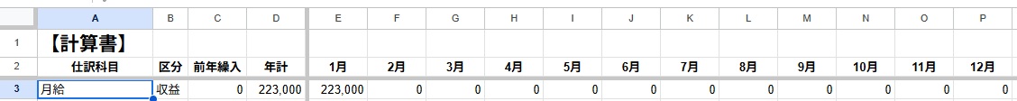 普通は1月-12月の計だけだが、資産と資本と負債に関しては前年度からの繰入(C列)も加算するようにする。