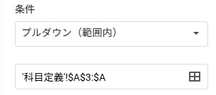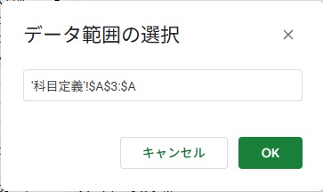 - 科目定義シート に切り替え、セルA3から下方向へ仕訳科目を入れてある範囲全部を含むだけセルを選択する。余分に未入力セルを選択しておいてもかまわない。もしくは直接「'科目定義'!$A$3:$A」とタイプしてもかまわない。念のため絶対参照にしておく。