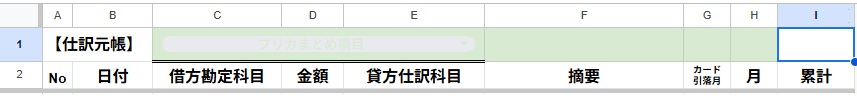- G列 クレジットカードの引落月を記帳する列。クレジットカード会社ごとに引落月が違うため自動化できないので手入力するための列。