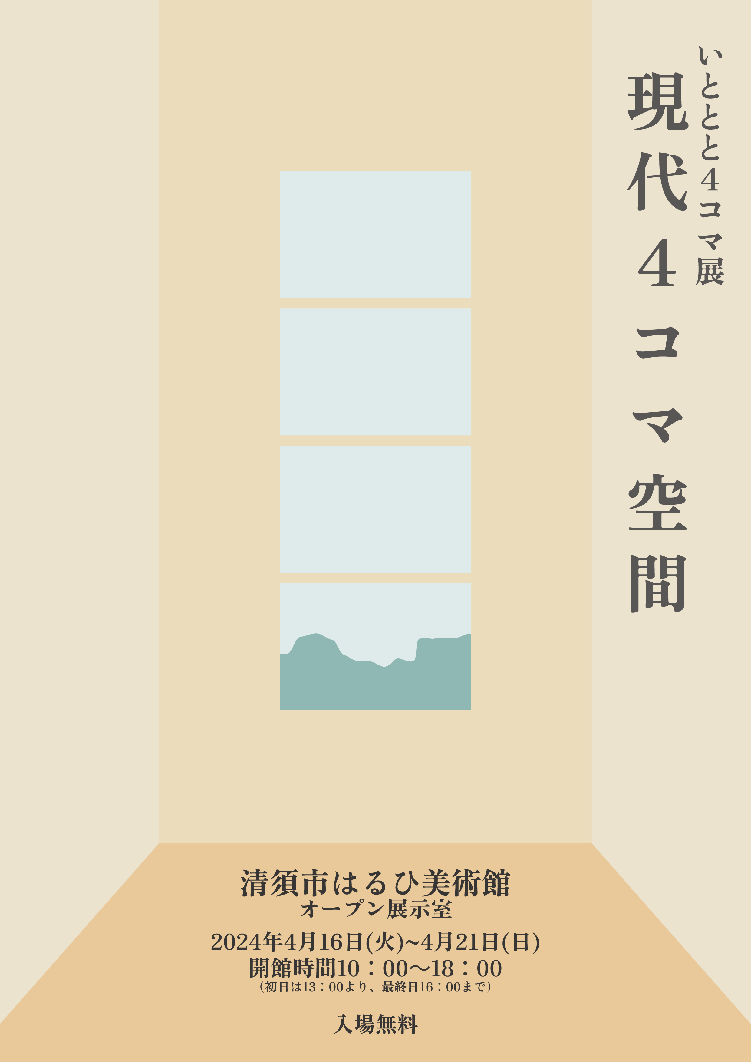 現代4コマ空間は、2024年4月16日から同年4月21日まで愛知県清須市の清須市はるひ美術館オープン展示室にて開催された、現代4コマの展覧会である。正式名称は「いととと4コマ展 現代4コマ空間」。現代4コマの提唱者である概念作家・いととと(@itototo1010)が主催し、鑑賞は無料で行われた。本展は美術館での開催が決定したのが開催直前の時期であり、告知も開始2日前の2024年4月14日にX(旧Twitter)上で行われた。会期は6日間と短かったが、「美術館に現代4コマが出現する」という意表を突いた内容で注目を集めた。
