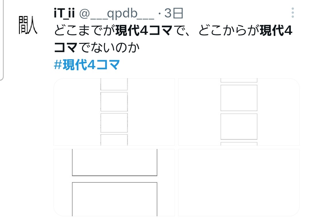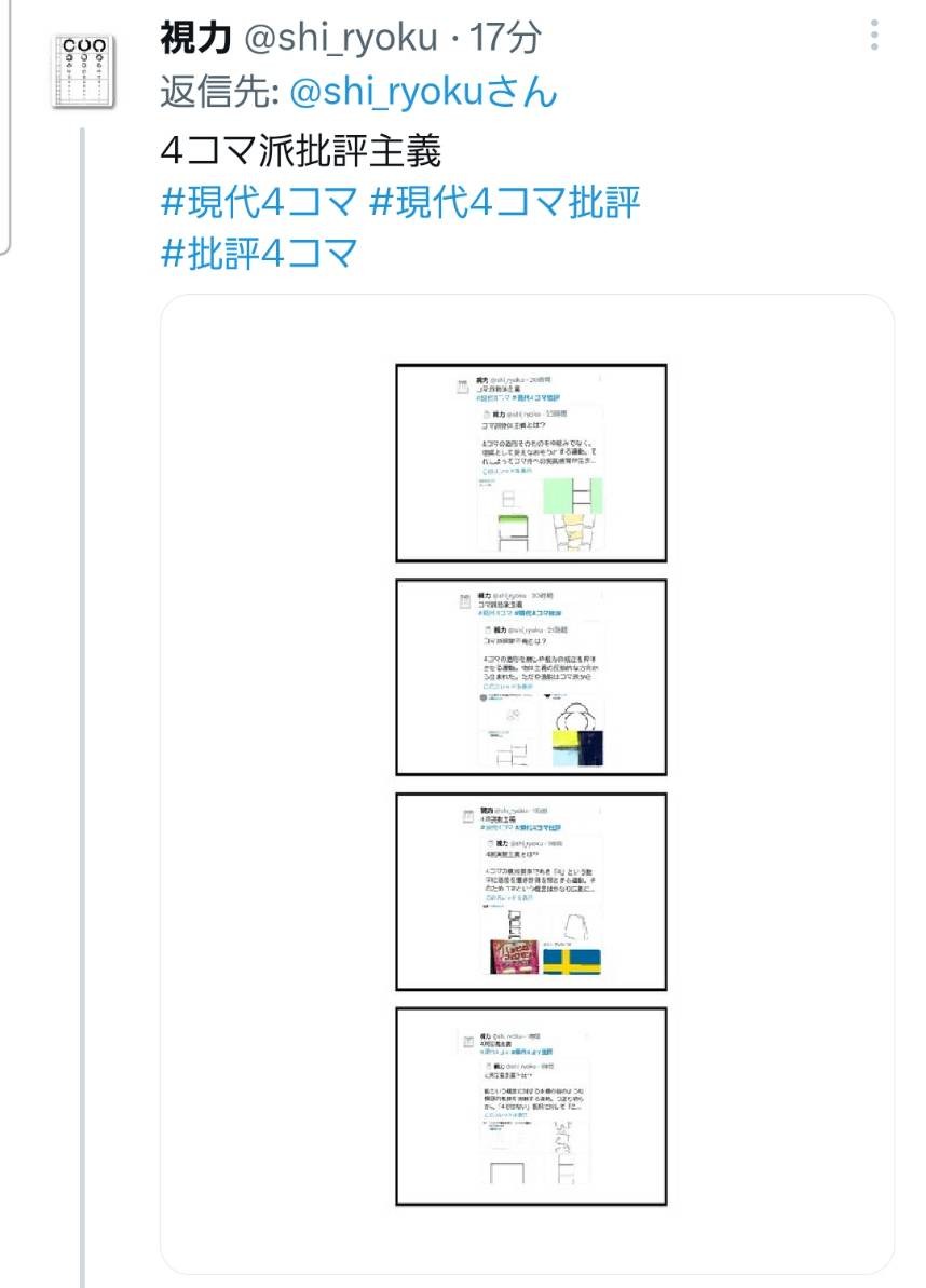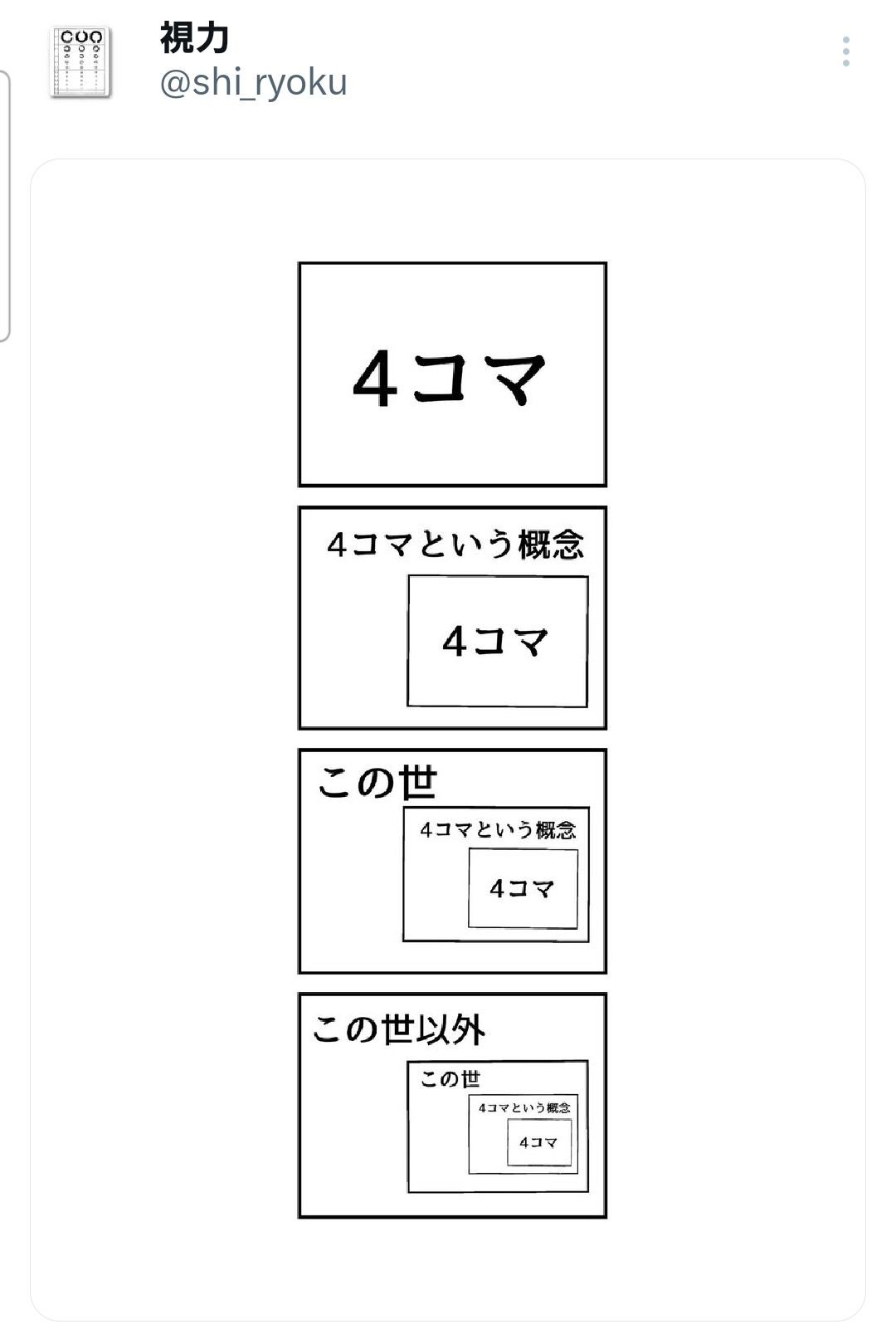 4コマの造形そのものを枠組みでなく、物質として捉えなおそうとする運動。それによってコマ外への実質感覚が生まれ相対的に作品の境界領域にも空間理解が発展している。コマを枠内の世界表現だと認識していた場合にその世界に閉じ込められているのは我々の方だと気付かされる。