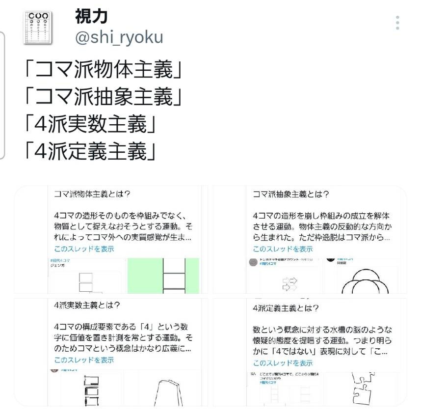 数という概念に対する水槽の脳のような懐疑的態度を提唱する運動。つまり明らかに「4ではない」表現に対して「これは4コマだ」と言い張る試み。これによって訪れる数学の知識常識はコペルニスク的転換を迎え現代4コマとは何かの再構築を促される。結局我々は枠内しか認識出来ない。